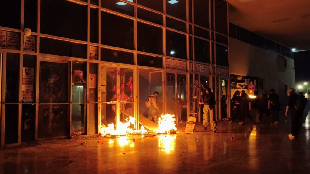 Entrada la noche, rompieron e incendiaron la puerta principal del edificio del Poder Ejecutivo y cuando lograron ingresar al recinto le prendieron fuego a las oficinas del primer piso. Después de registrarse varias explosiones, elementos de Bomberos y de la Policía Estatal arribaron al lugar para controlar el siniestro.
